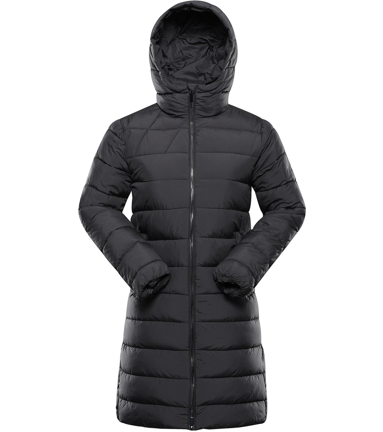 Strih je polopriliehavý, čo zaisťuje pohodlné nosenie aj voľnosť pohybu, zatiaľ čo dekoratívne prešitie dodáva kabátu moderný a ženský vzhľad. Praktická kapucňa je pevná a chráni pred vetrom aj chladom. Súčasťou kabátu sú aj dve vrecká, vhodné na uloženie drobností alebo zahriatie rúk. Celkový dizajn dopĺňa decentná nášivka na rukáve, ktorá podčiarkuje športovo-elegantný štýl.